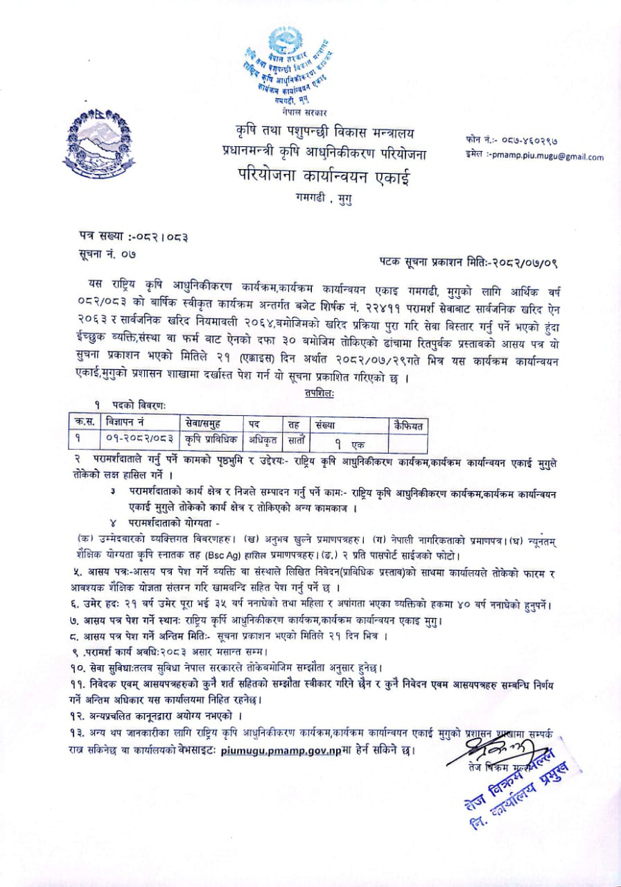 सेवा परामर्श प्राबिधिक कृषि अधिकृतको प्रस्तावना माग सम्बन्धमा। 2082-07-09